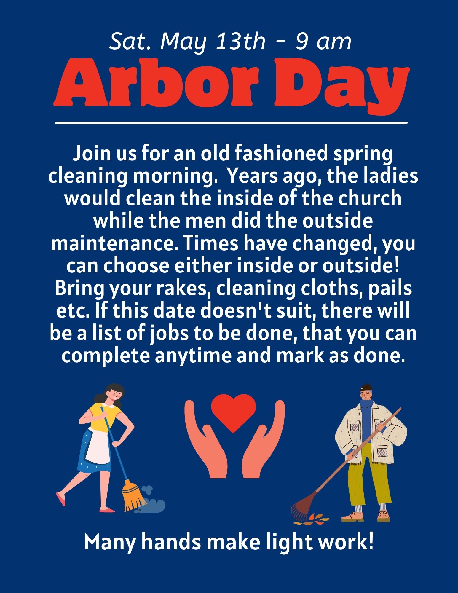 Saturday, May 13, 2023  **Please note that due to a funeral, the inside cleaning will not be done on Saturday. Exterior cleanup will still be done from 9 am to 11 am. There will not be a BBQ lunch.